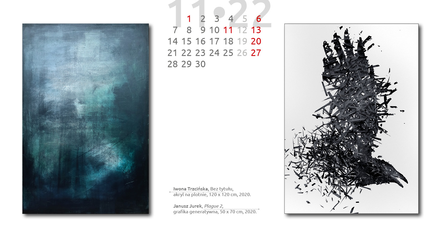 Biennalowe spotkanie – wystawa naszego środowiska plastycznego trwa. Drzwi galerii pozostają otwarte. Przekraczajcie zatem nasze progi. Zgodnie z obietnicą oprócz drukowanego Almanachu z pracami wszystkich uczestników tegorocznej edycji, przygotowaliśmy także tapety… dla Waszych komputerów (tła pulpitu w Windowsie, obrazy biurka na Mac’ach) z kalendarium 24. miesięcy 2021-2022, w trzech najpopularniejszych wersjach (proporcjach) ekranowych: 4:3, 16:9, 16:10. Sprawicie nam wielomiesięczną radość częstując się poniższymi pakietami, które z łatwością, lub ewentualnym wsparciem poniższych linków, zainstalujecie (tapetowanie z Windowsem: https://pl.soringpcrepair.com/how-disable-smartscreen-in-windows-7/; https://support.microsoft.com/pl-pl/windows/zmienianie-tła-i-kolorów-pulpitu-176702ca-8e24-393b-15f2-b15b38f69de6; tapetowanie z Mac’iem: https://support.apple.com/pl-pl/HT207703).